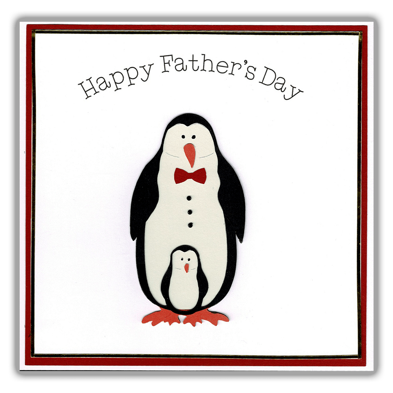 A lovely layered card decorated with a cute penguin wearing a bow tie. Above the penguin are the words “Happy Fathers Day”. The card is finished with a gold and red border.