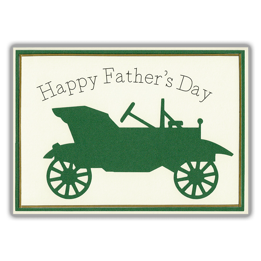 A lovely silhouette Card decorated with a vintage car. The card carries the words “Happy Fathers Day”. The card is finished with a gold border.